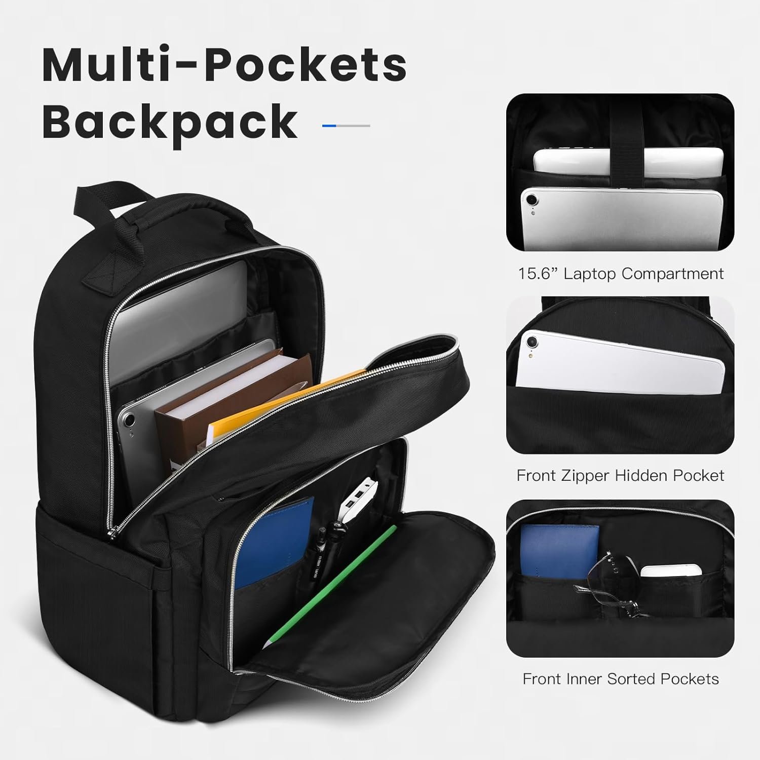 - Multi-functional Compartment: Larger roomy compartments can provide separated space for computer, iPad, A4 files, wallet, clothes, power bank and more your items. Zippered front pocket can hold some small but commonly used items. laptop compartment dimensions fits up to 15.6 inch laptop, back-hidden pocket can put smartphones or passport